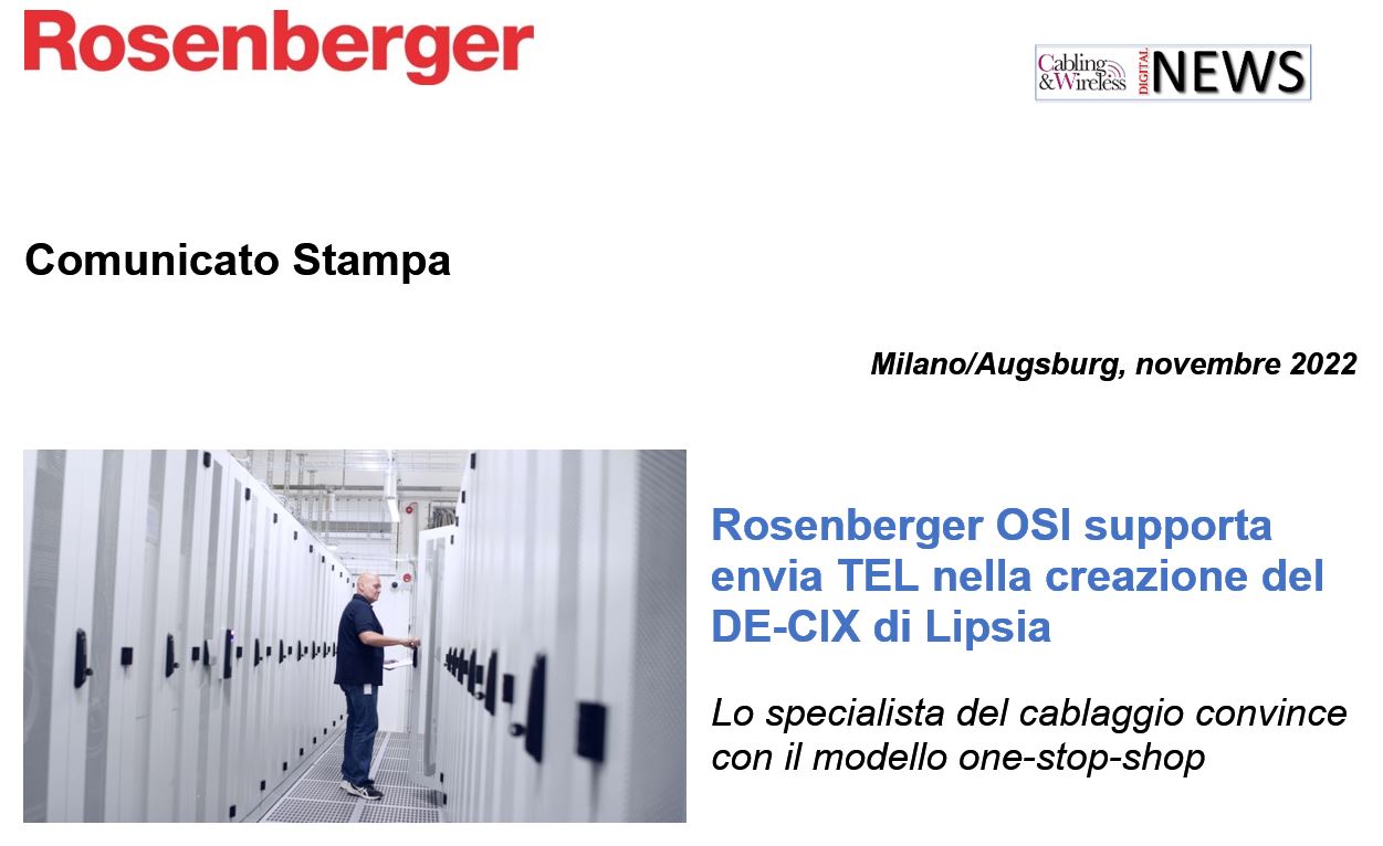 Rosenberger Optical Solutions & Infrastructure (Rosenberger OSI), esperto di connessioni in fibra ottica, soluzioni di cablaggio e servizi infrastrutturali, annuncia la realizzazione di un importante progetto di cablaggio con il fornitore di servizi di telecomunicazioni envia TEL. Il nodo Internet DE-CIX Leipzig, punto nevralgico di scambio dati internazionale che si trova, tra gli altri, nel data center envia TEL di Lipsia, è stato messo in funzione con successo e con prestazioni elevate grazie all’intervento del personale specializzato di Rosenberger OSI.